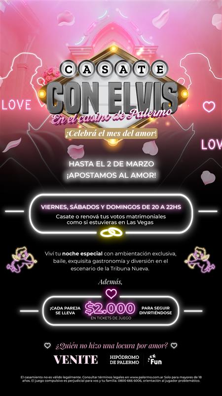 El Casino del Hipódromo de Palermo ofrece una propuesta única para celebrar el mes del amor. Del 7 de febrero al 2 de marzo, inclusive ¡apostá al amor! Todos los viernes, sábados y domingos de 20 a 22h, Palermo te invita a casarte con Elvis o a renovar tus votos matrimoniales como si estuvieras en Las Vegas. Flopy Tesouro será parte de la inauguración el viernes próximo.