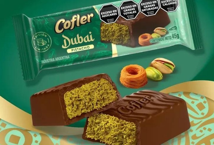 En línea con este fenómeno cultural y de consumo, en 2025 Arcor lanzó Cofler Dubái, una propuesta que combina chocolate con leche, abundante relleno de pistacho y texturas crocantes de kadayif.