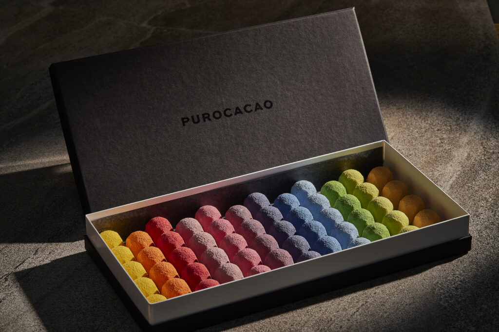Creada por Rodrigo Bauni –fundador de PUROCACAO– y su equipo de su Chocolatiers, los bombones están rellenos con una crema untuosa de chocolate combinada con frutas y dulces como durazno, maracuyá, naranja, berries, coco, frutilla, rosas, pistacho, arándanos, menta, dulce de leche y limón.